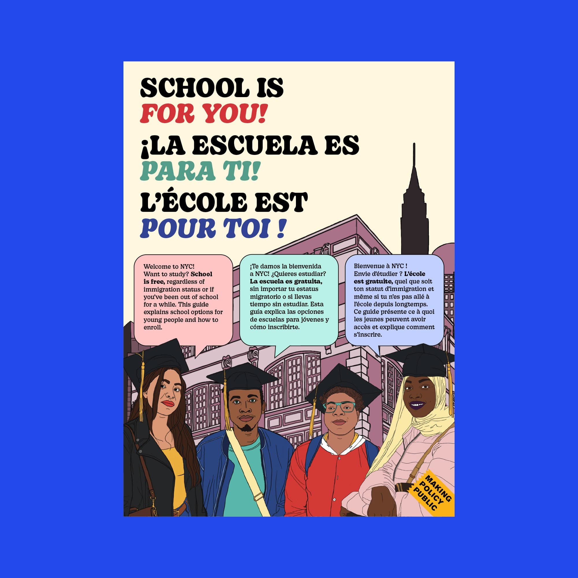 A trilingual guide for young immigrants that explains their school options in NYC.